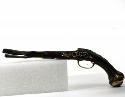 This pistol with its brass serpentine side plate was recovered from the wreck site of the sunken ship Whydah.